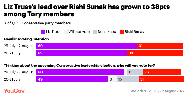 YouGov发布的最新民调显示,外交大臣Liz Truss得到了69%保守党成员的支持,而前财政大臣Rishi Sunak的支持率为31%。在7月20-21日的上一次调查中,这些数字分别为62%和38%。