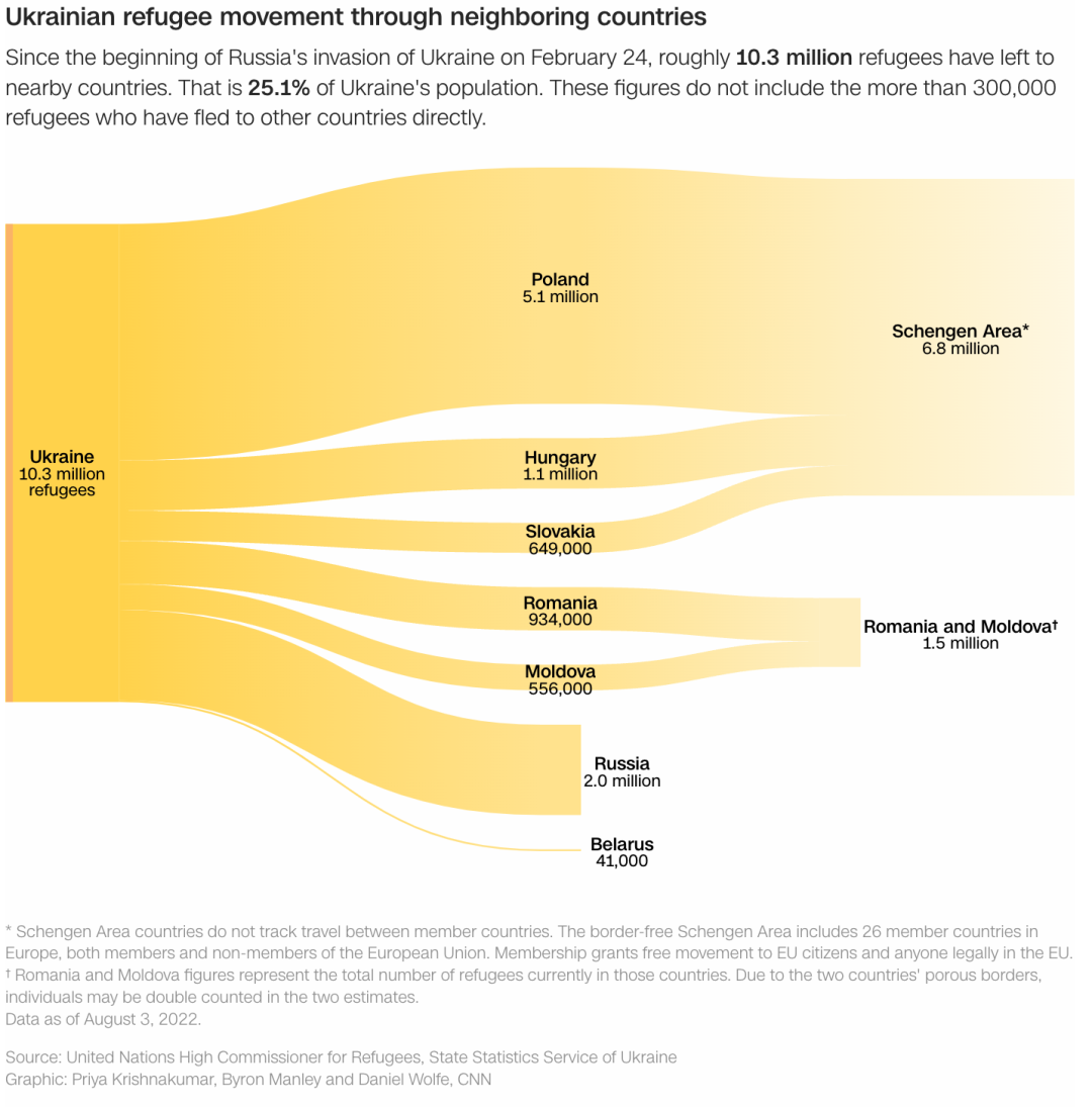 根据同一研究,欧洲各地记录的来自乌克兰难民人数已达6,180,946人。接收大量难民的欧洲国家包括波兰(120万)、德国(90万)和捷克共和国(40万)。