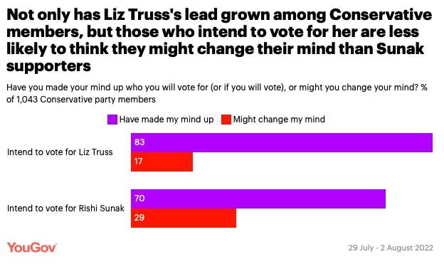 该调查机构的调查表明,与Rishi Sunak的支持者相比,Liz Truss的支持者会改变主意的可能性较小。