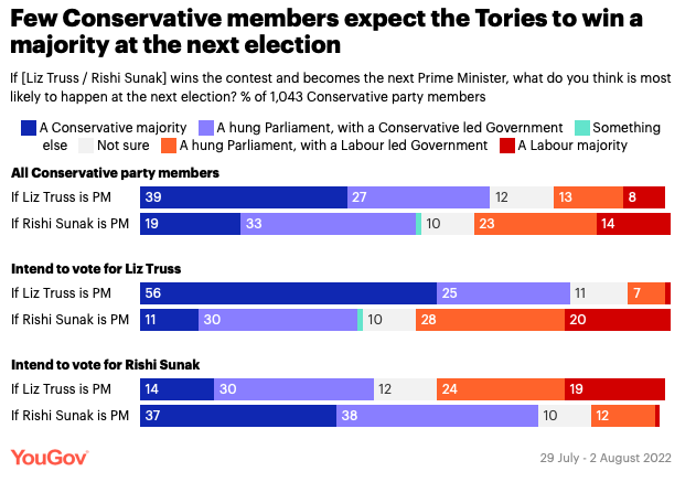 YouGov的数据显示,只有39%的成员认为,在外交大臣Liz Truss的领导下,保守党可以在下次选举中赢得多数席位。如果Rishi Sunak执政,这么可能性将更小,仅有19%。
