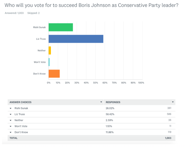 在ConservativeHome于8月3日(周三)发布的一项针对保守党党员的新调查发现,选择Liz Truss成为下一任保守党领袖、首相的支持率已在不到24小时内升至58%。Rishi Sunak的支持率为26%,12%的人仍未作决定。