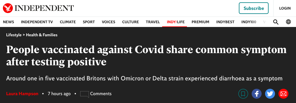 根据ZOE新冠健康研究应用程序收集的数据,除了疲劳、喉咙痛和头痛等新冠常见症状,接种疫苗后的新冠阳性感染者更易报告出现腹泻。