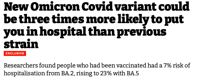 葡萄牙研究人员发现,完成疫苗接种和接种加强剂的人因感染BA.2住院的风险为7%,而感染BA.5的住院风险上升至23%,是前者的3.3倍。