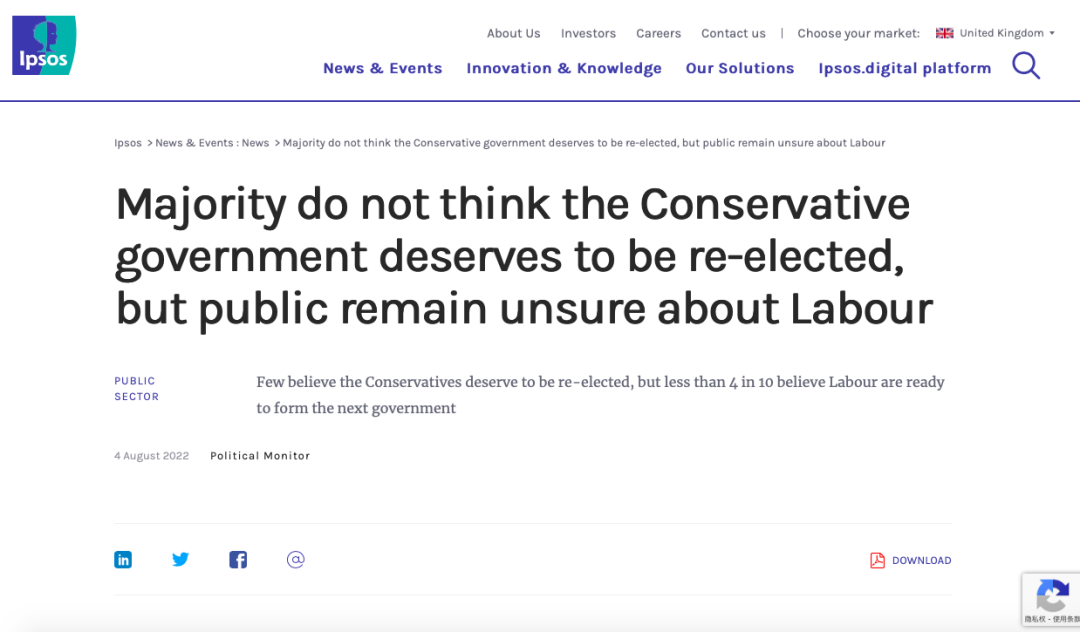 Ipsos公司表示,“有很多证据表明,公众对保守党在几个重要领域的应对方式不满意。然而,对工党是否准备好接任政府也存在分歧。