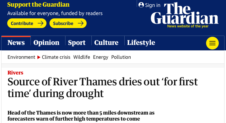 河流信托基金的政策和科学主任Rob Collins博士称,“在极端高温和长期的干旱天气下,这是首次出现这种情况。泰晤士河位于格洛斯特郡Gloucestershire的源头已经干涸,现在只能在下游5英里多的地方(即Somerford Keynes)看到微弱的水流。