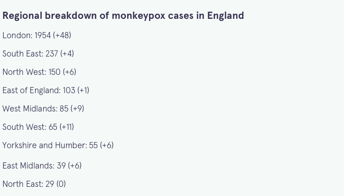 到目前为止,大多数感染者是男性同性恋者、双性恋者或与其他男性发生性关系的人。英国确诊病例中99%是男性,平均年龄为37岁,仅有22例女性病例。伦敦仍是英国疫情的中心,占报告病例的约73%。