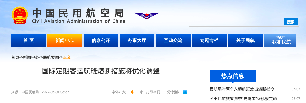 据中国民航局报道,于8月7日起对国际定期客运航班熔断措施进行优化调整。调整后的熔断措施为: