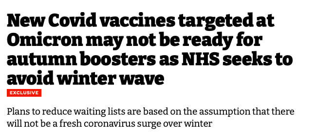 研究表明,辉瑞Pfizer和摩德纳Moderna的新版疫苗可以对预防Omicron变种及其亚株分支感染有较高的有效性,且在降低住院风险方面更有效。但药品和保健品管理局(MHRA)仍在考虑是否批准该疫苗在秋季接种计划中使用。