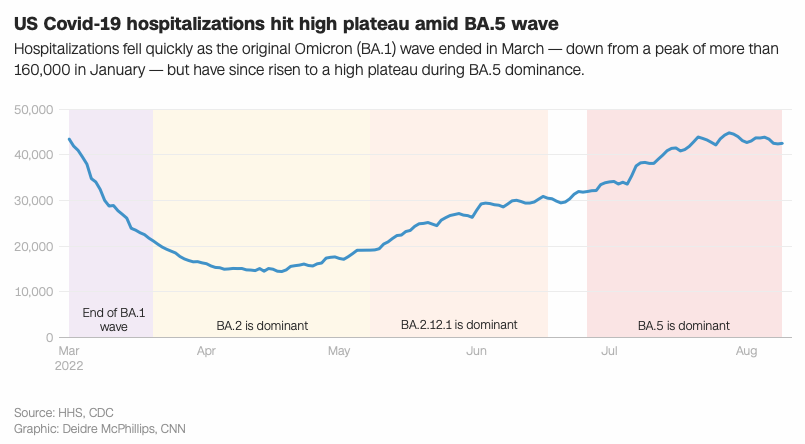 据CNN报道,美国似乎已经达到了另一个“新冠峰值”,在过去一个月左右的时间里,每日有超过40,000感染者住院,超过400人死亡。与2021年冬天相比,该数字已经明显下降——在第一波Omicron浪潮的高峰期,住院人数是现在的四倍,死亡人数是其六倍。