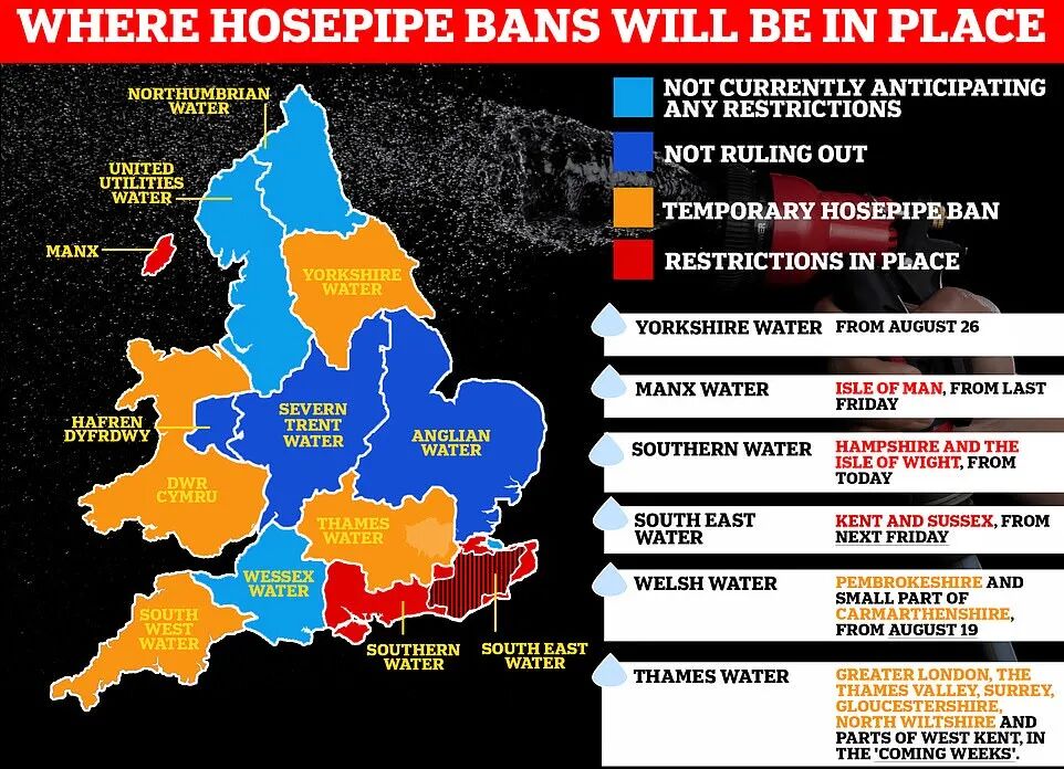 南方水务、东南水务、约克郡水务公司和威尔士水务公司已经宣布实施“软水管禁令”。