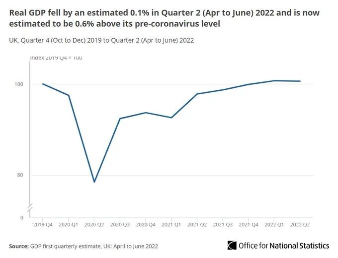根据英国国家统计局(ONS)的官方数据,英国经济在截至6月的三个月里停滞不前,且萎缩了0.1%。英国央行预计今年晚些时候经济将进入衰退期,预计该衰退期将保持至2023年底。