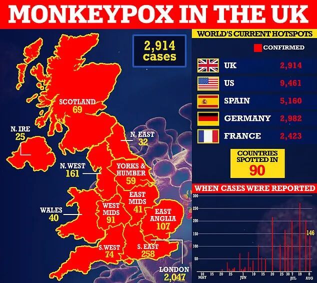 英国卫生安全局(UKHSA)的最新数据显示,自今年年初以来,英国累计确诊猴痘病例2,914例,疑似病例103例。伦敦病例占约71%(2,047),但非伦敦地区的确诊病例比例也在增加。