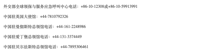 如遇紧急情况,请及时联系中国驻英国使领馆: