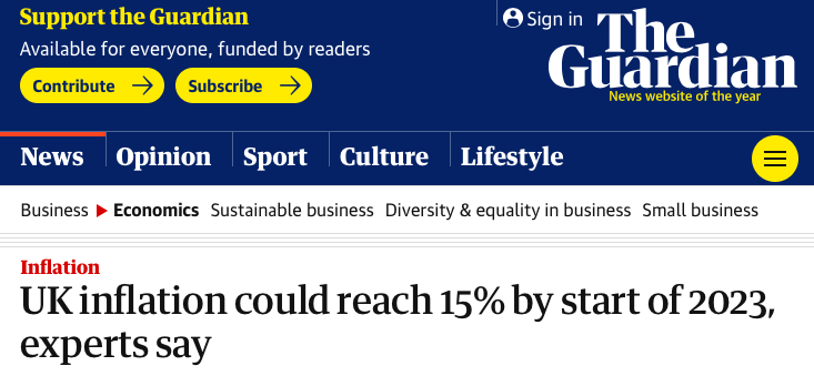 英国央行预测,通货膨胀率将在今年年底达到13%,在2023年达到15%。