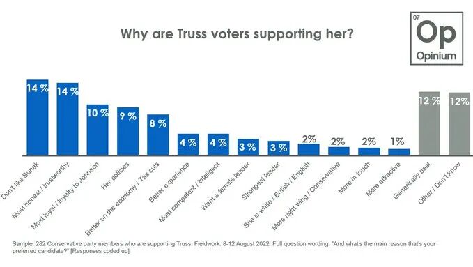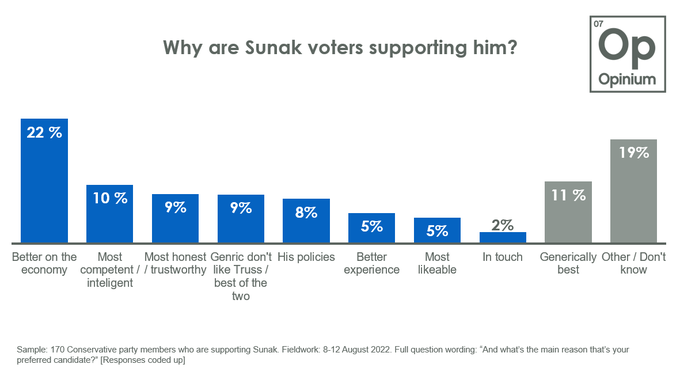 相对而言,支持Rishi Sunak的理由看起来“靠谱得多”——经济优势(22%);更有能力/更聪明(10%);更值得信赖/诚实(9%)。