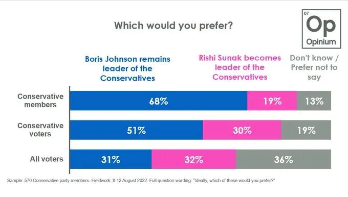 而在与前财政大臣Rishi Sunak的选择中,68%的人支持鲍里斯,19%的人选择Rishi Sunak。