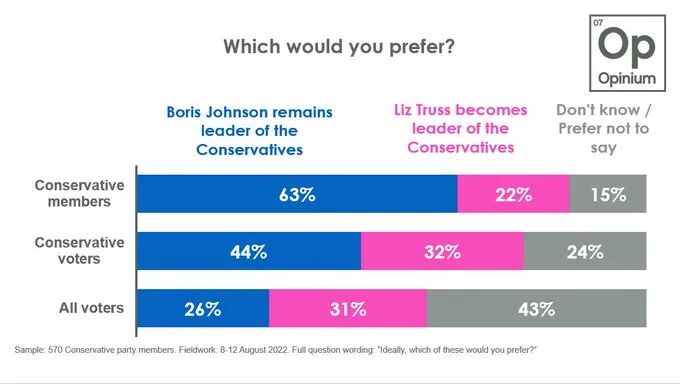 另一项保守党内成员调查显示,对鲍里斯的喜爱甚至超过了两位候选人。在与外交大臣Liz Truss的选择中,63%的保守党成员选择鲍里斯,Liz Truss的支持率仅为22%。
