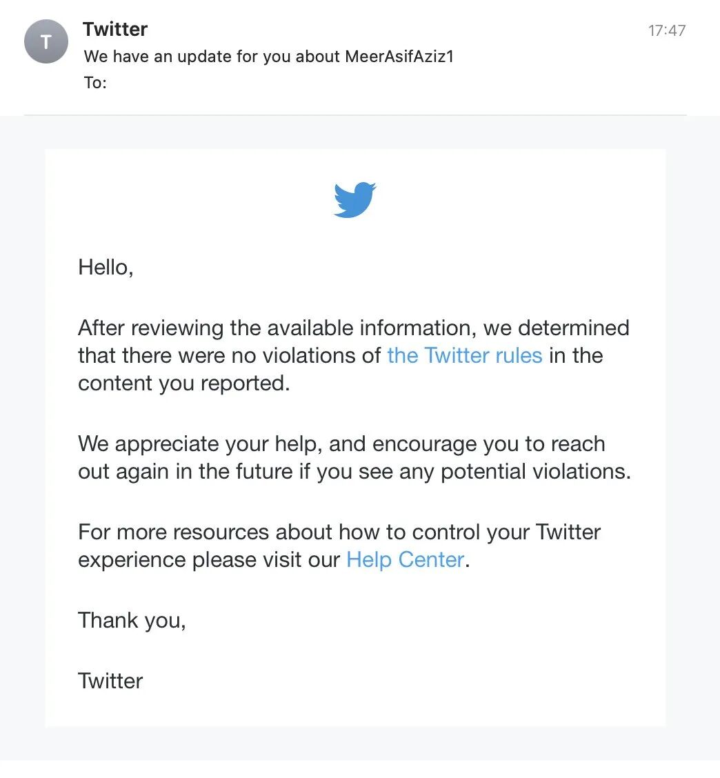 然而,在Twitter的最新回复中表示,不认为Meer Asif Aziz的做法违反了平台规定。