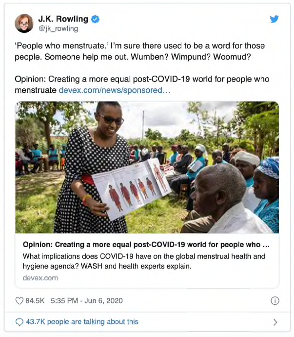 J.K.罗琳转发文章称,“‘来月经的人’,我相信曾经有个词是用来形容这些人的——女人。” | 图片来源CBC/Twitter@jk_rowling