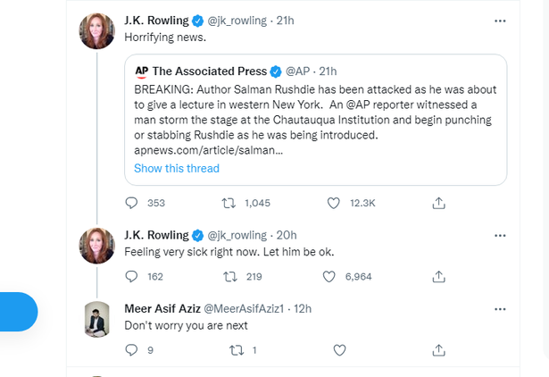 J.K.罗琳在社交媒体上就此遇刺事情发帖称:“骇人听闻。现在感觉很不舒服。希望他(拉什迪)尽快康复“。