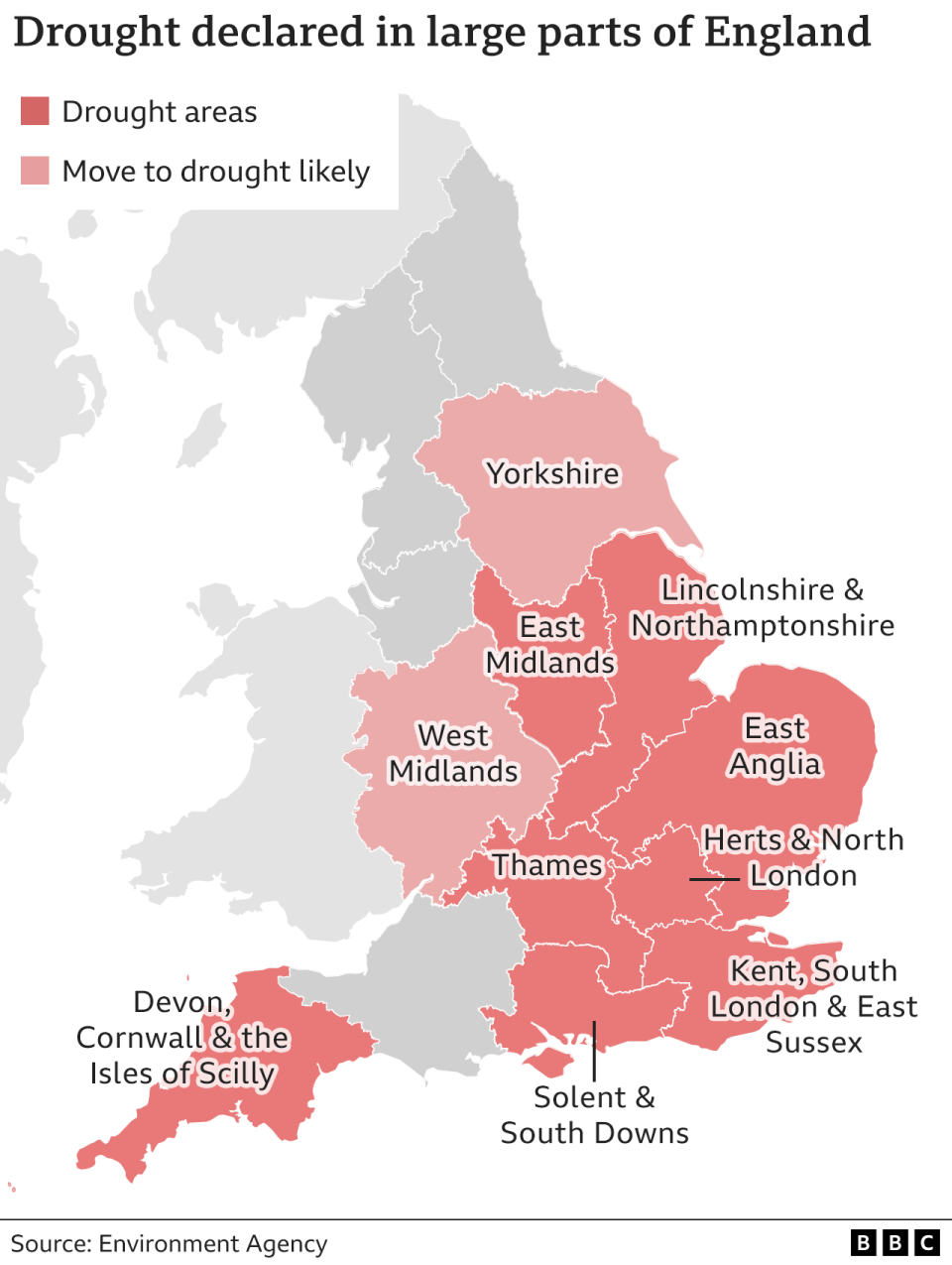 由环境局、政府、水务公司和主要代表团体的高级决策者组成的国家干旱小组,决定宣布干旱状态,以应对“50年来最干旱夏天”。最近两次干旱分布是在2011年和2018年宣布的。