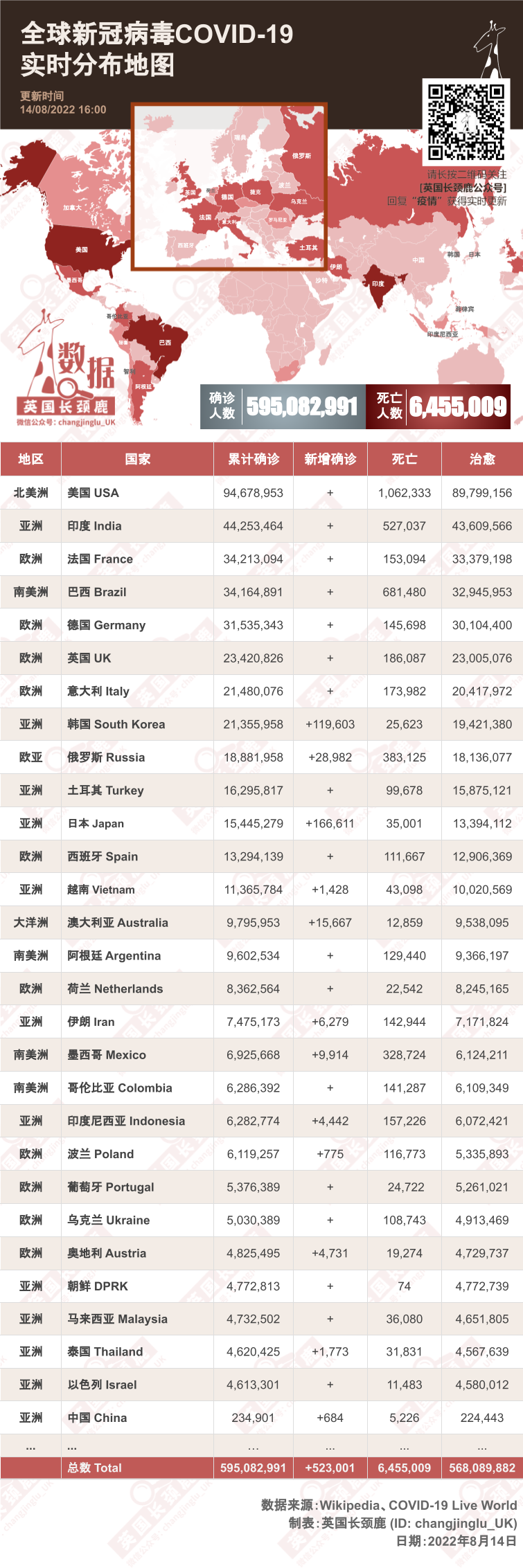 世界的累计确诊人数截止2022年8月14日17:00超过5亿9,508万例(*),死亡超过645.5万例(*)。