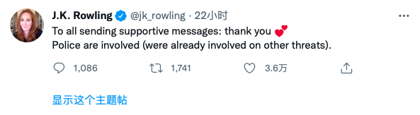 J.K.罗琳随即要求社交平台对该极端分子的账号进行处理,并声明,警方已经介入调查。“给所有发送支持信息的人:谢谢你们。警方已经介入”。