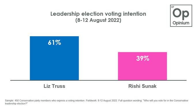 调查发现,61%的人支持Liz Truss,39%的人选择Rishi Sunak。