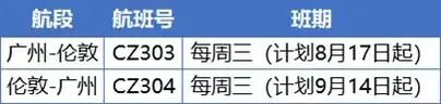 南航8月起恢复广州-伦敦航线,9月起恢复伦敦-广州航线。