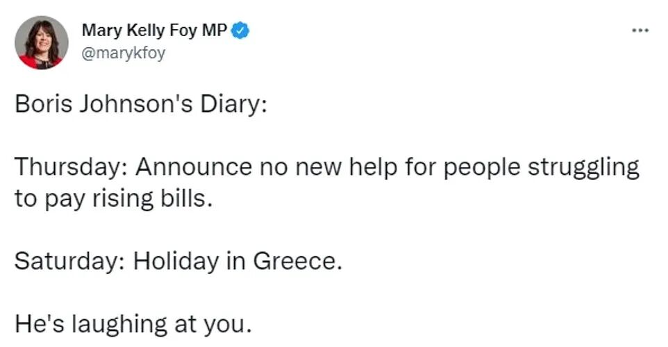 鲍里斯离任前愈发”懒散“的工作态度遭到了工党批评。议员Mary Kelly Foy在社交媒体上分享了“鲍里斯日记 Boris Johnson's Diary”:“周四:不会对支付不断上涨的生活成本提供新帮助;周六:在希腊度假...这其实是他在嘲笑你”。