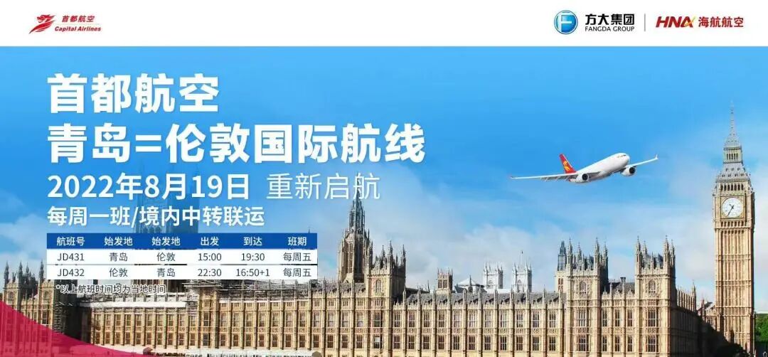 首都航空8月19日正式恢复青岛⇌伦敦直飞客运航班。