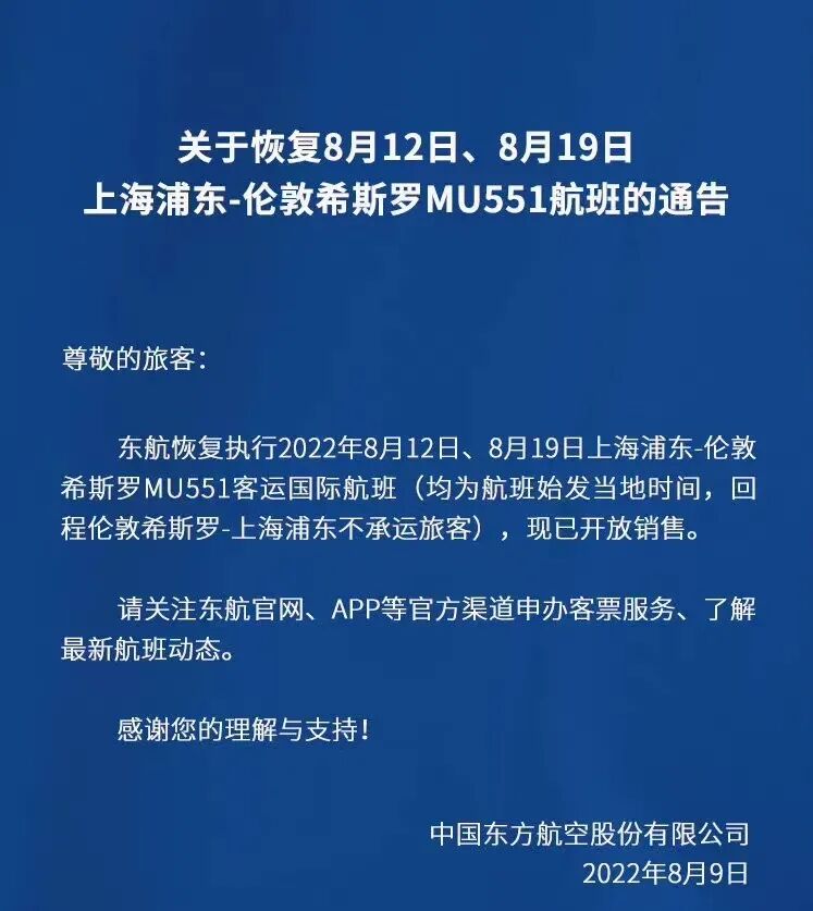 东航8月起恢复上海-伦敦航线。
