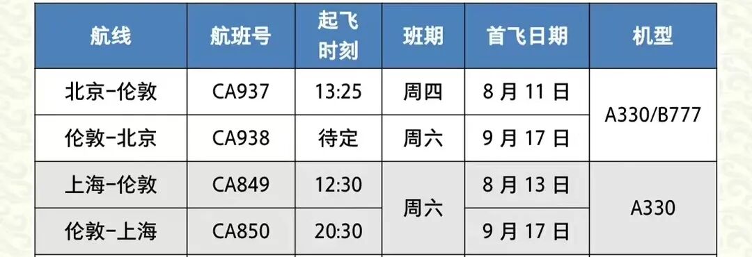 8月12日起,国航陆续恢复北京-伦敦、上海⇌伦敦航线。