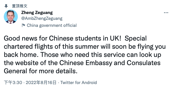 驻英大使郑泽光先生在社交媒体官宣这一消息👇