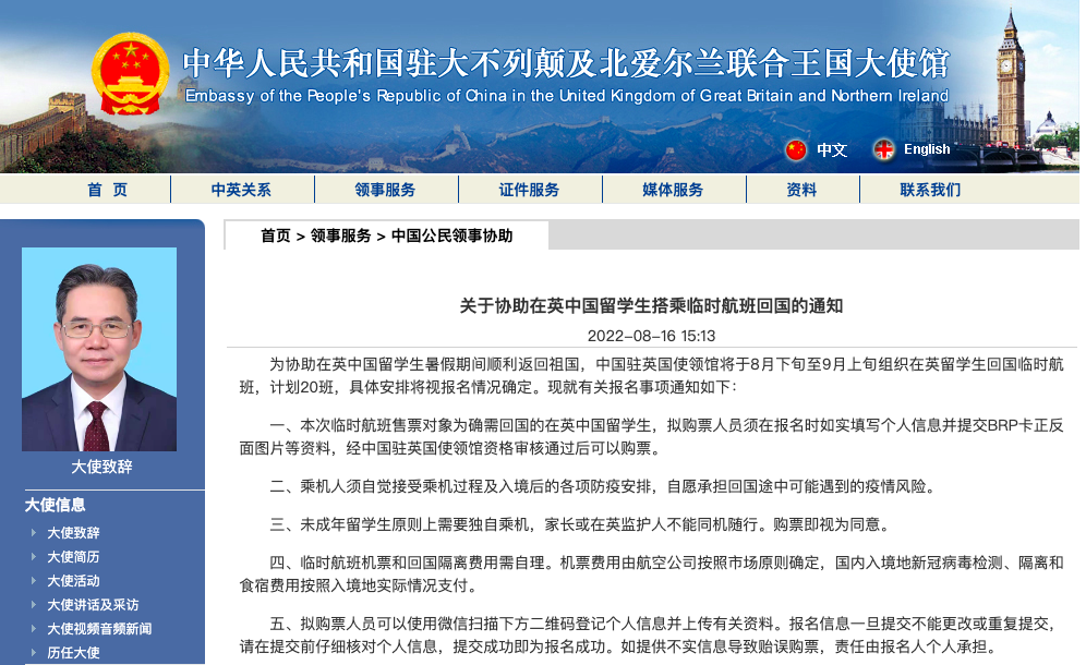 关于此次临时航班回国的完整通知:http://gb.china-embassy.gov.cn/lsfw/lsxz/202208/t20220816_10744038.htm