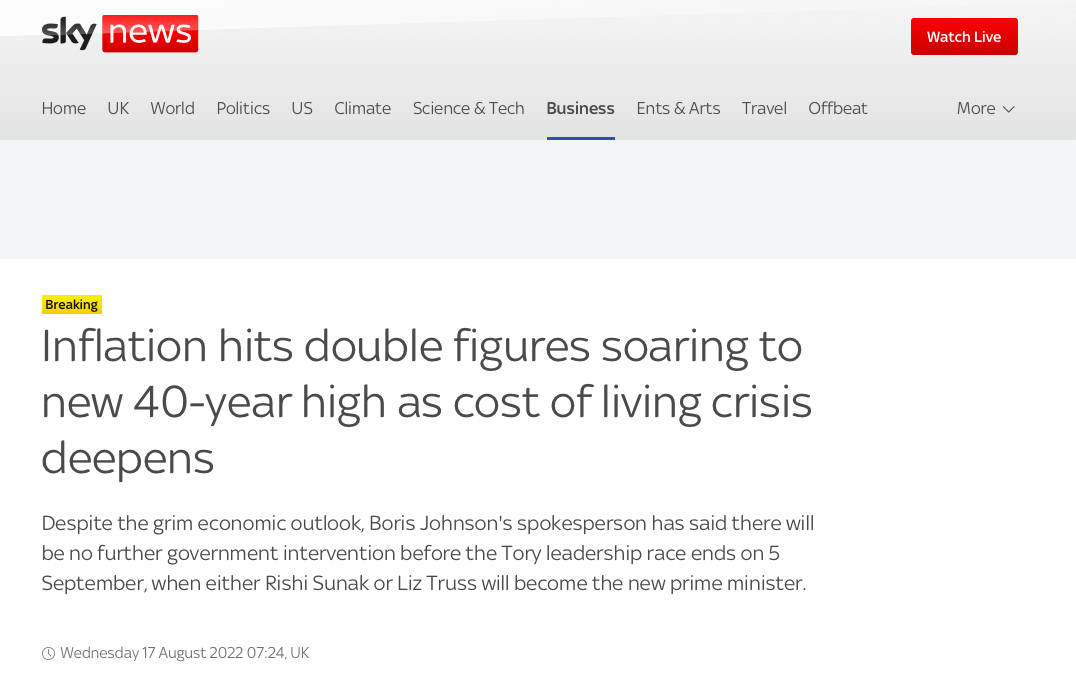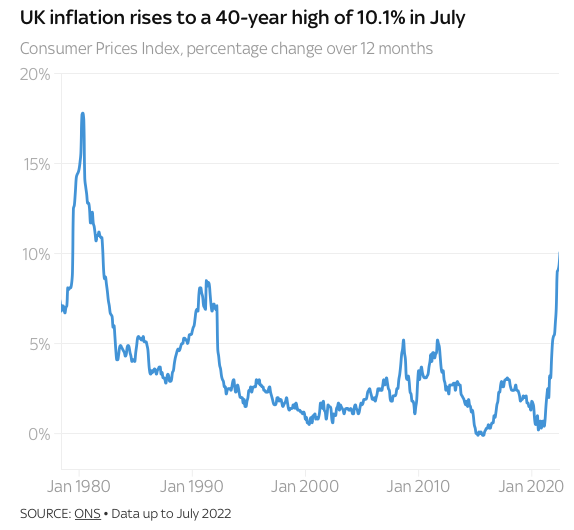随着生活成本危机加剧,英国通货膨胀已经飙升至40年来的新高。国家统计局(ONS)表示,在截至7月的12个月里,消费者价格指数(CPI)上升至10.1%,高于6月份的9.4%,并保持在1982年2月以来的最高水平。