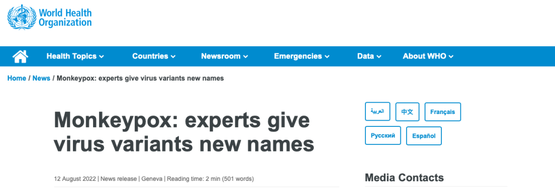 另外,世卫组织已于8月12日更新了对猴痘病毒分支的名称,新名称由罗马数字和小写英文字母组成。