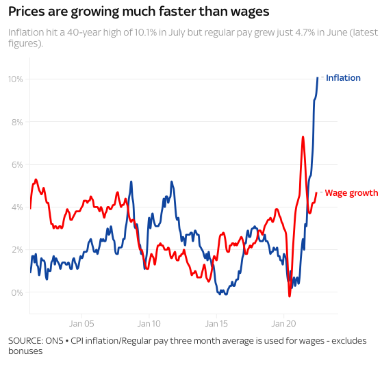 面对飞速上涨的物价,各行业员工遭受了创纪录的实际工资降幅。数以百万计的公共部门雇员预计将在今年秋天就薪资问题采取罢工行动。