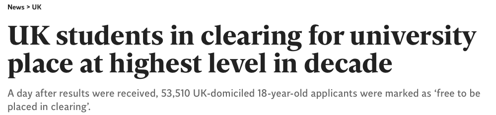 截至8月19日(周五)上午,Ucas上有53,510名在英国定居的18岁申请人被标记为补录(free to be placed in clearing)。