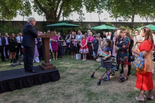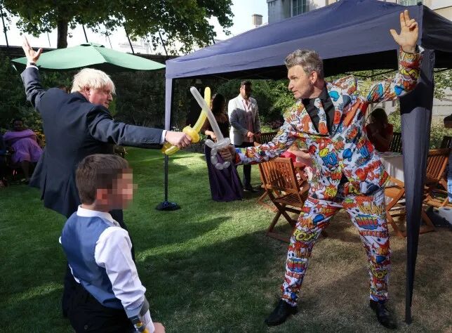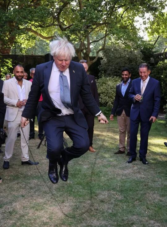 在假期开始前的唐宁街10号酒会上,鲍里斯与47岁的儿童艺术家Damian Pickett“决斗”、现场展示自己的跳绳运动细胞。