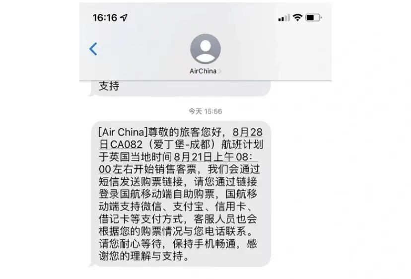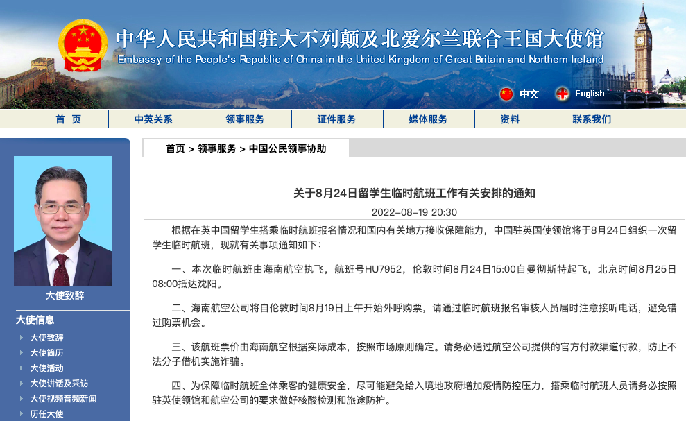 自8月16日中国驻英国大使馆发布在英中国留学生搭乘临时航班回国通知后,截至目前,已公布两个计划航班详情:
