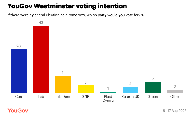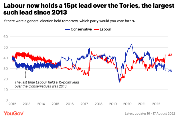 在调查网站YouGov为《泰晤士报》(The Times)进行的一项民调中显示,工党获得了43%的选民支持,比保守党(28%)领先15个百分点。创下该民调机构自2013年2月以来记录的最大工党领先优势。