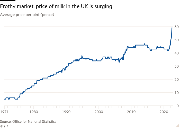 上个月,奶农表示,供应和管理费用飙升,现在每升牛奶的生产成本为44便士,而一年前为23便士。