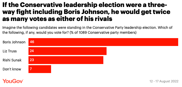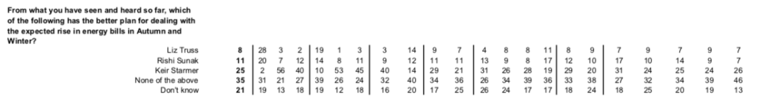 事实上,当被问及如果还能支持现任首相鲍里斯Boris Johnson,选民会投给谁时,投票者们显然更喜欢鲍里斯(46%),其支持率高于Liz Truss(24%)和Rishi Sunak(23%)。