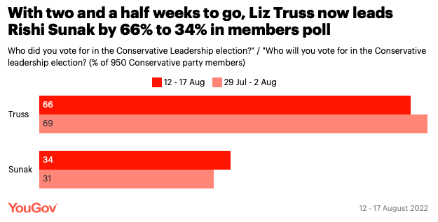 而在保守党内的竞争中,最新结果显示,Liz Truss的支持率为66%(在8月12日至17日的调查中为69%),前财政大臣Rishi Sunak为34%(上次为31%)。