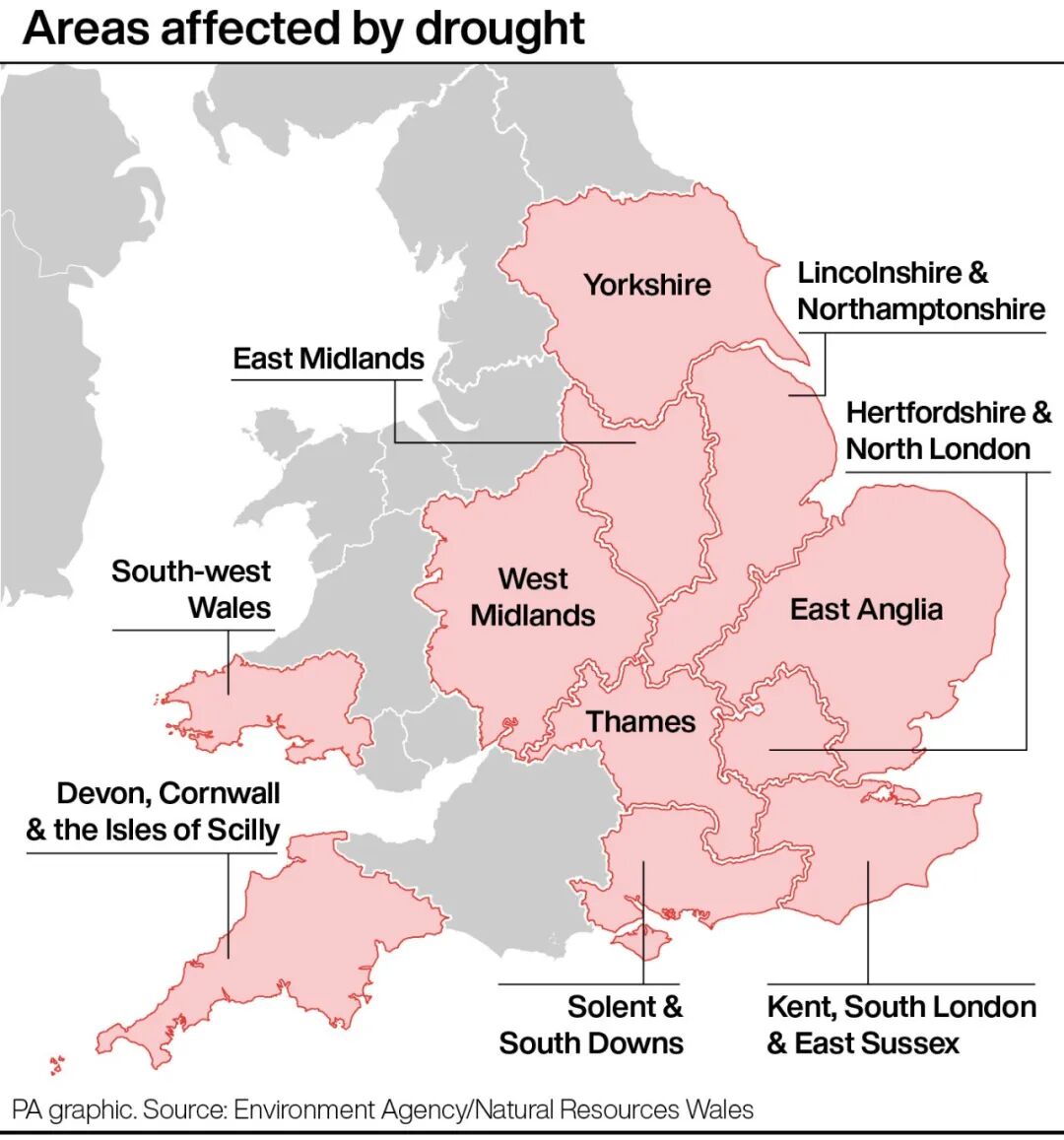 英国宣布干旱状态的地区 | 图片来源BBC