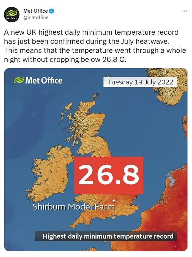 另外,英国在7月创造了新的夜间高温记录,7月19日凌晨4时32分,牛津郡Shirburn示范农场的水银温度均在26.8℃以上。这意味着在24小时内,温度从未低于这一水平,创造了英国新纪录。