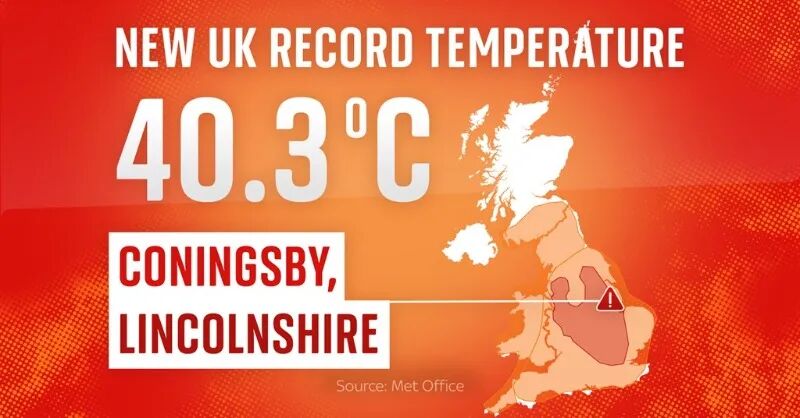 目前英国的最高气温是7月19日,林肯郡Coningsby达到了40.3℃,也是英国首次超过40℃。