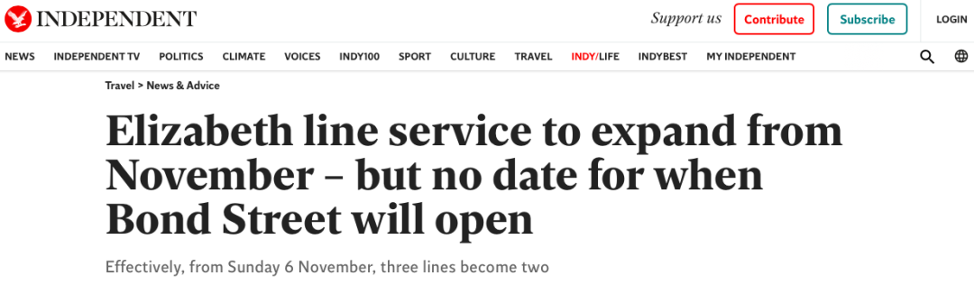 伦敦伊丽莎白线Elizabeth Line,又称横贯铁路Crossrail。2022年5月开通以来,该路线在帕丁顿Paddington和Abbey Wood之间运营,除周日外,每天早上6时30分至晚上11时提供列车服务。并承诺将在2022年秋季全面贯通该路线的运营。