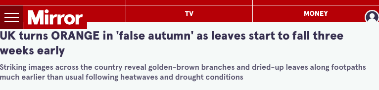 皇家园艺协会的高级园艺顾问Leigh Hunt表示,提早落叶和树叶变色是提早树木自然寿命结束的前兆。“它给人的感觉是我们已经在秋天了,但真正的秋天还没有开始。从生理上讲,植物无法对真正的秋天做出二次反应”。